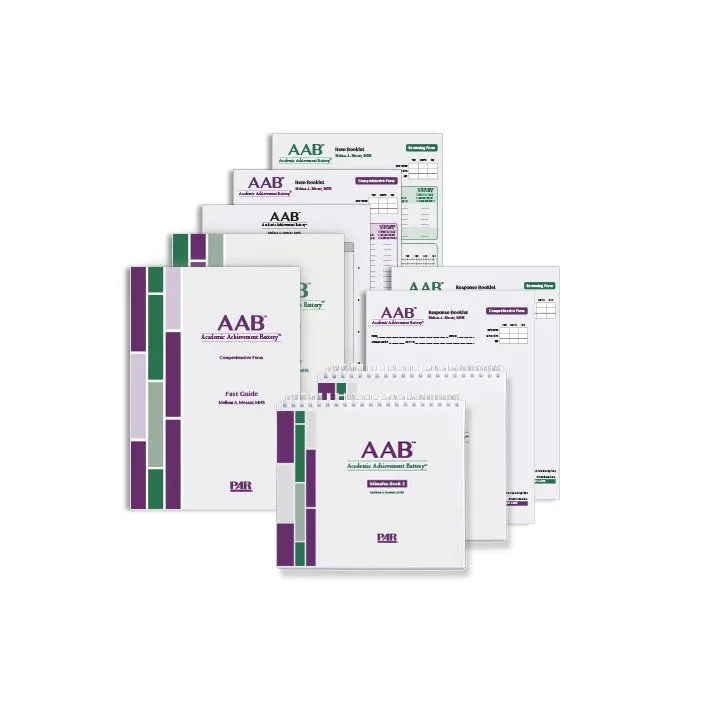 A complete yet affordable solution, the Academic Achievement Battery (AAB) can be administered to individuals ages 4 to 85 years in educational, clinical, or research settings. It comprised of two forms—a Comprehensive Form and a Screening Form. Everything you need to administer either version is printed directly on the forms, making administration and scoring straightforward and easy. In addition, both forms include a convenient Fast Guide to help you get started. Unlike similar measures, the AAB requires no certification or intensive preparation.